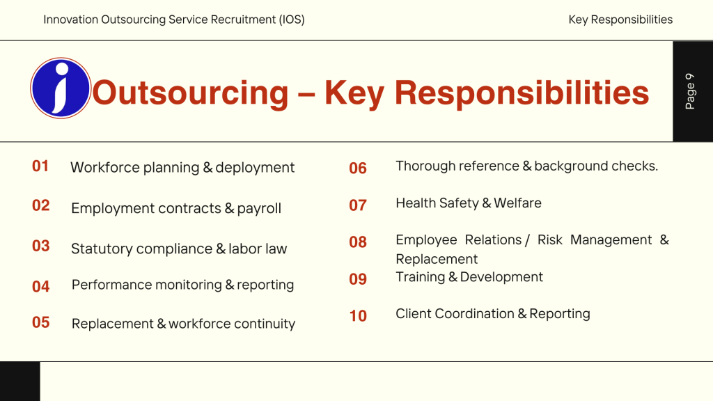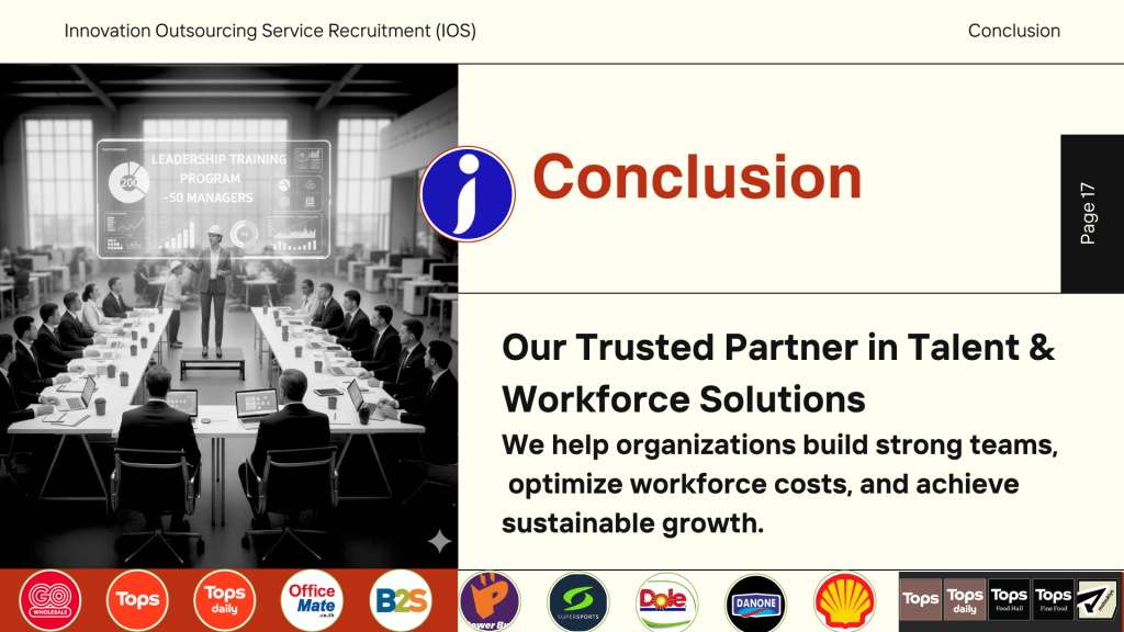 - Integrated Outsourcing Services (IOS): เปลี่ยนพนักงานหน้างานให้เป็นระบบ Outsource 100% โดยเราดูแลตั้งแต่การสรรหา ฝึกอบรม จ่ายเงินเดือน จนถึงสวัสดิการ