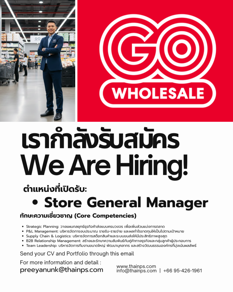 GO Wholesale ธุรกิจค้าส่งสมัยใหม่ที่เติบโตอย่างรวดเร็ว กำลังมองหา ผู้บริหารระดับสูง (Store General Manager) ที่มีวิสัยทัศน์ แข็งแกร่งด้านกลยุทธ์ การบริหารทีม และการขยายธุรกิจค้าส่งในระดับประเทศ