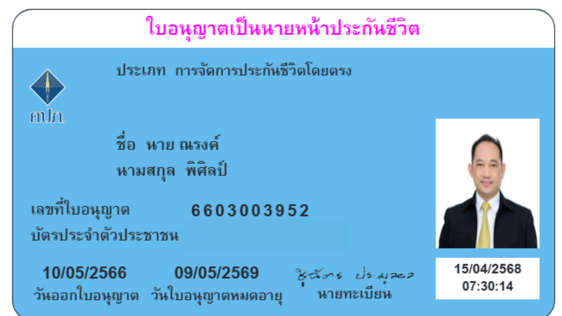 นายหน้าประกันชีวิต ใบอนญาต เลขที่:663003952