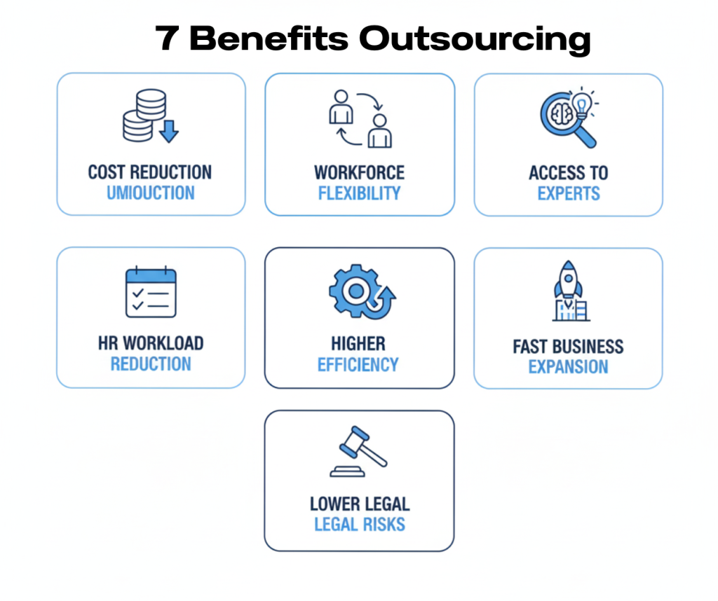 ผู้ให้บริการเอาท์ซอร์สรับผิดชอบงานบุคคลและกฎหมายแรงงานแทน เช่น การทำประกันสังคม เอกสารภาษี การเข้างานออกงาน รวมถึงการจัดการปัญหาพนักงาน ทำให้บริษัทลดความเสี่ยงทางกฎหมายและการฟ้องร้องที่อาจเกิดขึ้นได้
